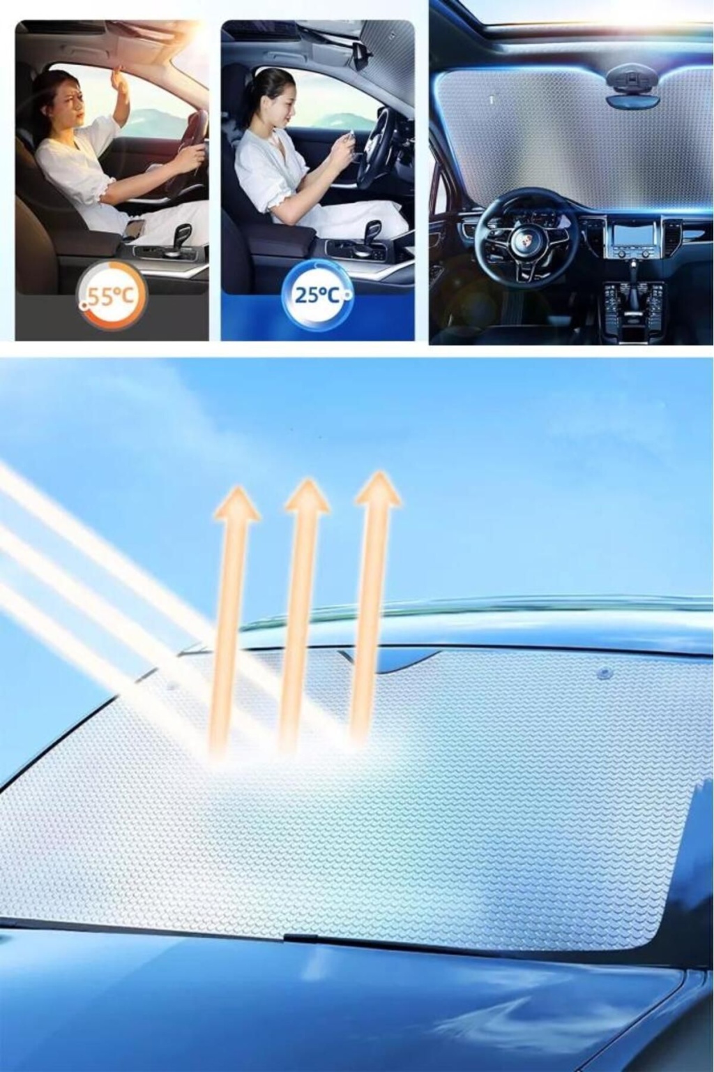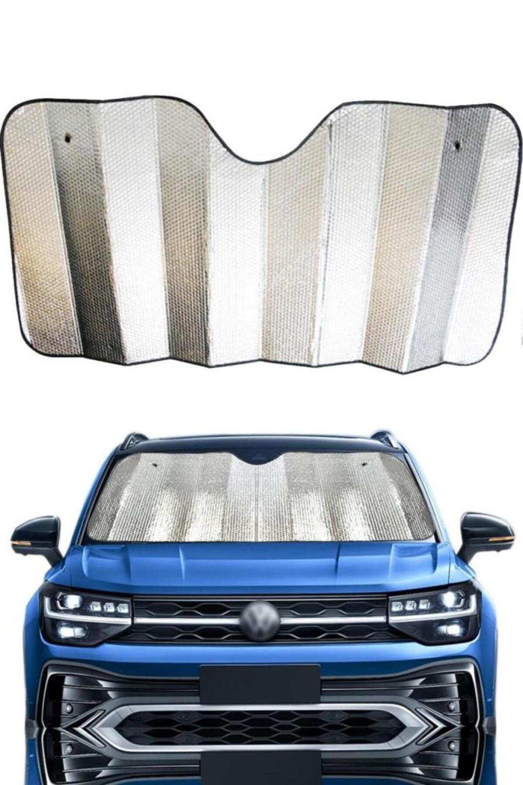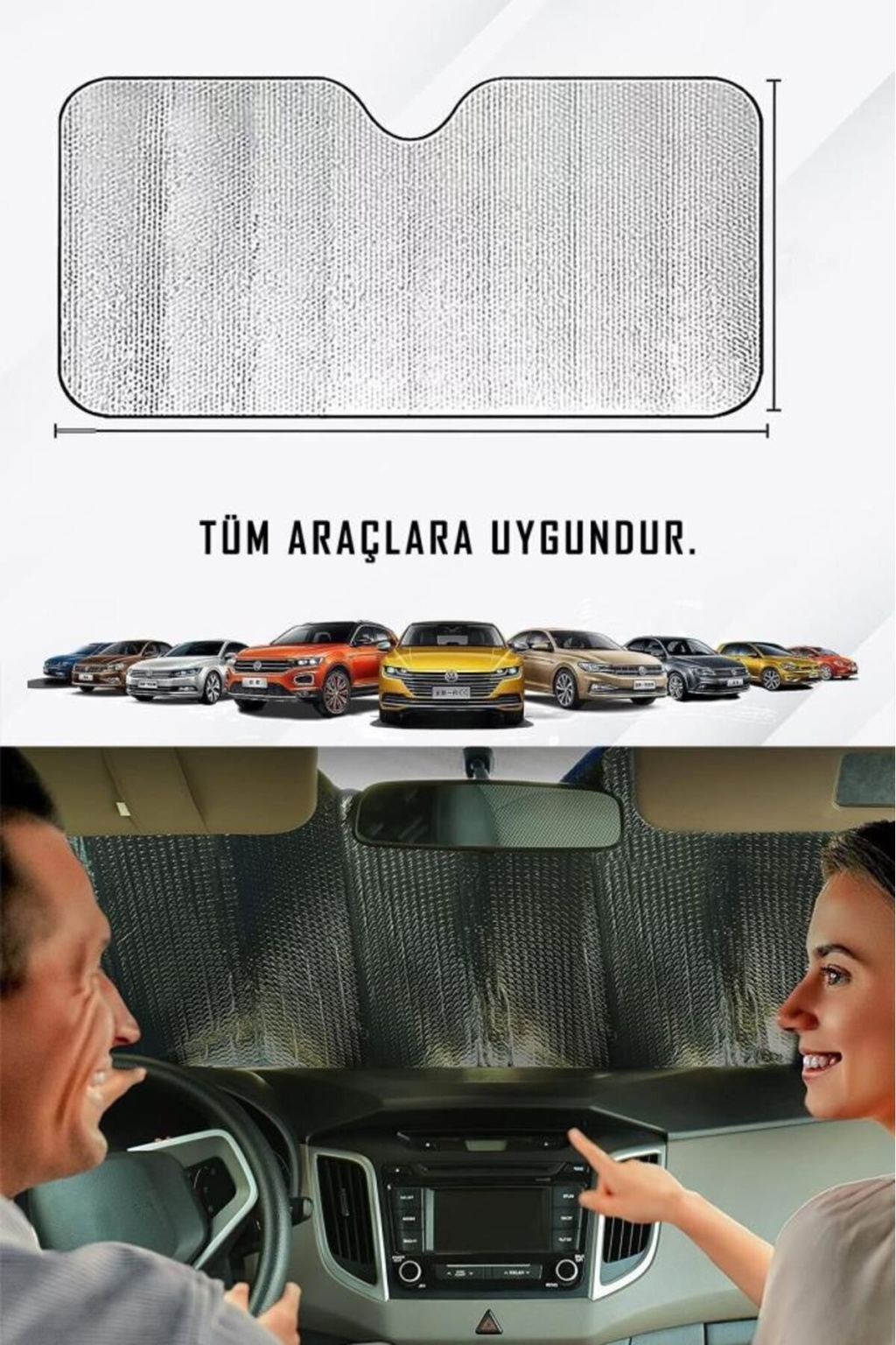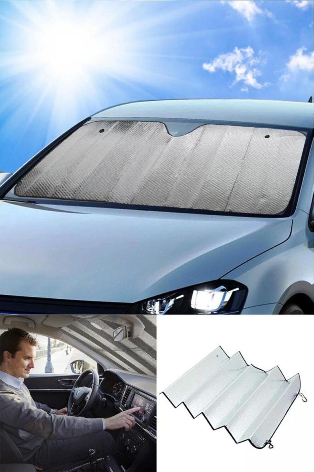 Araba Ön Cam Güneşlik Araba Cam Güneşliği Otomobil Güneşlikleri Araç Gölgelik Oto İçi Vantuzlu Araba ön cam güneşlik ultra lüks kaliteli araba ön cam güneşliği güneş ışınlarını geri yansıtan tasarımıyla aracınızı daha serin tutmanıza yardımcı olacak. ; Yaz günlerinde aracınızı güneş alan bir alana park etmek zorunda kaldığınızda aracınızı aşırı derecede ısınmış bir şekilde bulabilirsiniz. ; Ön cam güneşliği metalize reflektörlü alüminyum yüzeyiyle güneş ışığını %99'a kadar bloke ederek daha konforlu bir yolculuk olanağı sunar. ; 2 adet vantuz ile birlikte paketlenmektedir. ; Aracınızı daha kısa süre içerisinde serinletebilmenize yardımcı olarak zaman kaybını ve klima kullanımına bağlı yakıt tüketimini azaltmanızı sağlar. ; Süngerli iç yapısı ürüne ekstra izolasyon yapabilme özelliği katarak aracınızı aşırı ısınmaya karşı korurken, aracınızın deri, plastik ve kumaş aksamlarının da zararlı ışınlara bağlı olarak hasar görmesini engeller. ; Katlanabilme özelliğiyle aracınızda yer işgal etmeden kolayca taşıyabileceğiniz ürün, 140 cm'lik genişliği ve 70 cm'lik yüksekliğiyle tüm standart otomobil modelleriyle uyumludur. ; Paket içeriği: 1 adet ön cam güneşlik , 2 adet vantuz ;