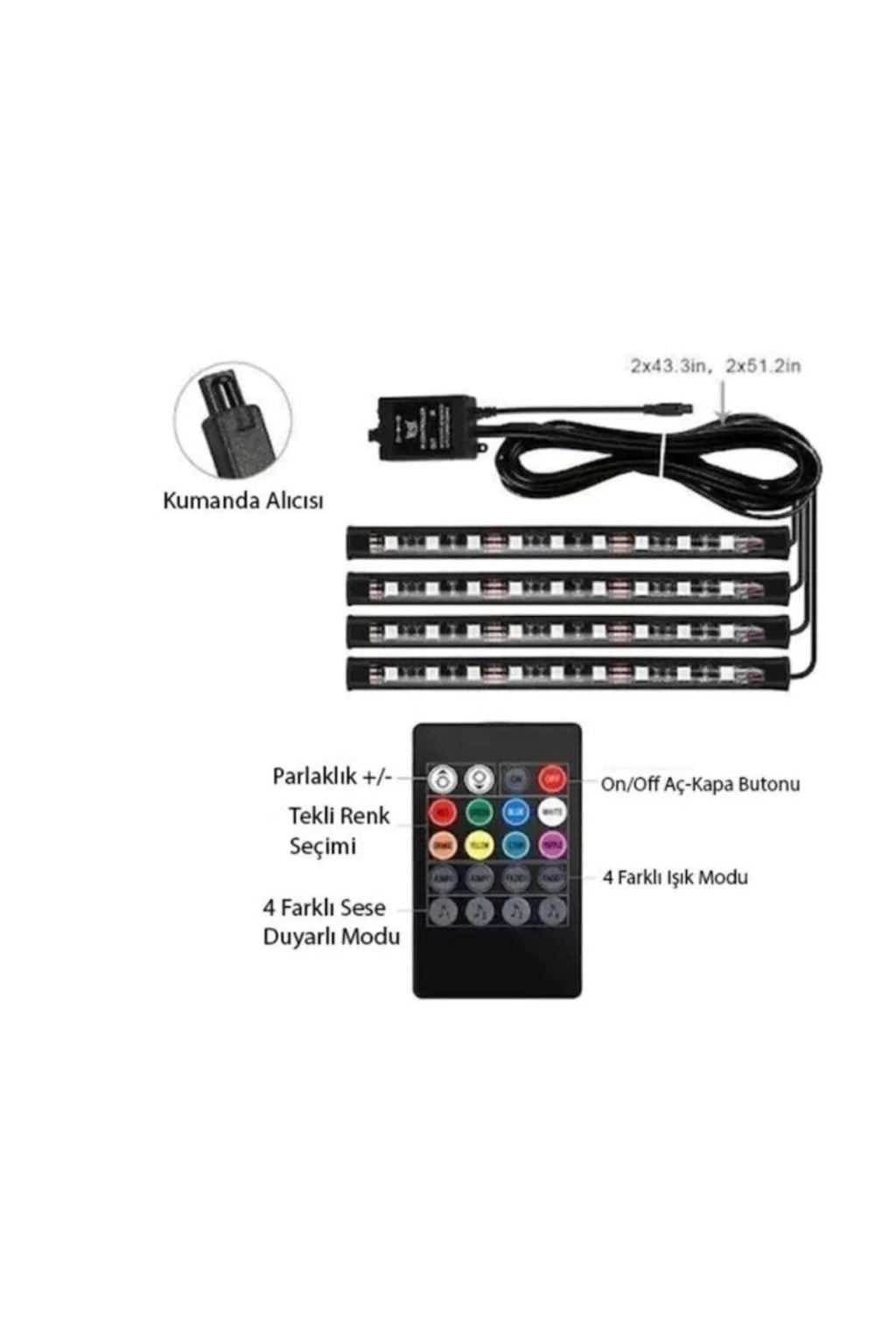"4 Parçalı Uzaktan Kumandalı Araç İçi Ayak Altı Led Atmosfer Işık 36 Led 9 Ledi" ürünü, aracınızın içinde atmosferik aydınlatma ve ambiyans oluşturmak için kullanabileceğiniz bir aydınlatma seti gibi görünüyor.; İşte bu ürünün bazı özellikleri: 4 parçalı set: Bu set, aracınızın farklı bölgelerine yerleştirmek için dört farklı aydınlatma parçası içerir.; ; 36 LED: Toplamda 36 adet LED ışık içerir, bu da oldukça parlak bir aydınlatma sağlayabilir.; ; Uzaktan kumandalı: Ürün, uzaktan kumanda ile kontrol edilebilir, bu da renk değişikliği, parlaklık ayarı ve farklı aydınlatma efektleri gibi özelliklere sahip olabilir.; ; Atmosferik aydınlatma: Araç içinde atmosferik bir aydınlatma yaratarak sürüş deneyiminizi özelleştirmenize yardımcı olabilir.; ; 9 LED'li parçalar: Her bir parça 9 adet LED içerir, bu da daha fazla aydınlatma noktası sağlar.; ; Bu tür aydınlatma setleri, aracınıza estetik bir dokunuş eklemek ve iç mekanı kişiselleştirmek istediğinizde kullanışlıdır.; Uzaktan kumandalı özellik, aydınlatmayı istediğiniz gibi ayarlamanıza olanak tanır.; Uygulama talimatlarını dikkatlice takip etmek, ürünü doğru bir şekilde kurmanıza yardımcı olur.; Ayrıca, ürünün aracınıza uyumlu olup olmadığını doğrulamak önemlidir.
