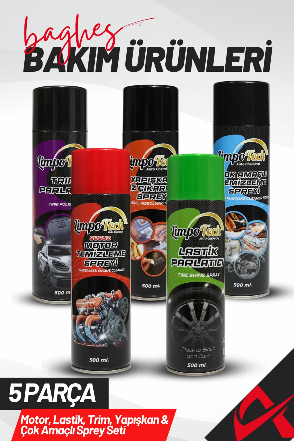 5’li Araç Bakım Seti – Trim Parlatıcı, Motor Temizleyici, Lastik Parlatıcı, Çok Amaçlı Temizlik