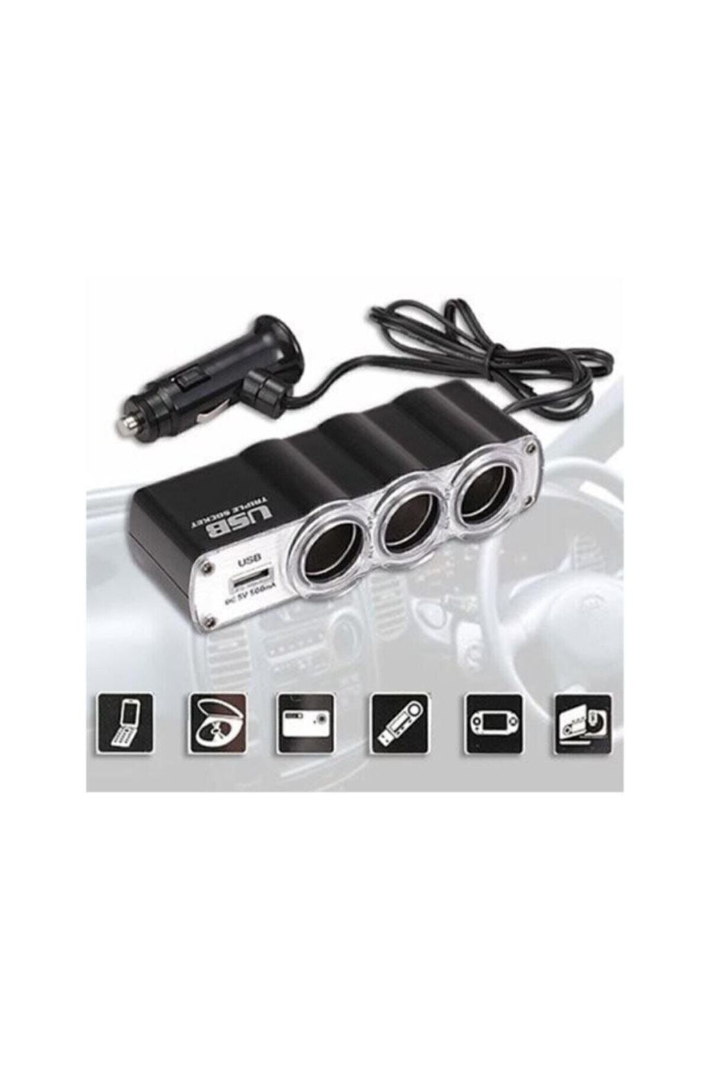 Ürün üzerinde 3 adet çakmak soketi girişi ve 1 adet usb girişi mevcuttur.; Aracınıza taktığınız zaman kullanabileceğiniz 4 ayrı port mevcut olmaktadır.; Çakmak soketlerine telefon şarj aparatınızı takarak telefonunuzu şarj edebilir yada usb girişinden telefonunuzu bağlayarak şarj edebilmektesiniz.; GPS, PDA, İpod ve Mp3 Çalar gibi birçok cihazınızı şarj etmekte kullanabilirsiniz.; Özellikler: 3 Adet çakmak soketi 1 adet usb giriş bölümü bulunmaktadır.; Cep telefon, GPS, PDA, İpod, Mp3 Çalar ve aklınıza gelebilecek daha birçok cihazınızı şarj edebilirsiniz.; Tekerlek şişirmek için kompresörlerinizi bağlayabilmektesiniz.; Oto ve USb girişli fanlarınızı çalıştırarak aracınızda klima etkisi yaratabilirsiniz.; Aracınızda kullanmak istediğiniz elektronik cihazlarınız için elektrik kaynağı düşünmenize gerek kalmayacak 4 port çoklayıcı.; Teknik Özellikler: Giriş Voltajı: DC12V/DC24V USB Çıkışı Gerilim / Akım: 5V-Max5.4V/500A Toplam çıkış gücü: 60W Çalışma Sıcaklığı :0-60 Bağıl Nem: 5% -70% Ürün Ebatı: 12x3x4 cm Paket İçeriği: USB & Üçlü Çakmak Soketi