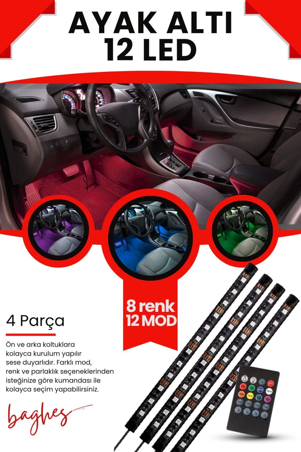 » Uzaktan kumandalı araç içi atmosfer ışığı, 4 Adet silikon esnek LED lambadan oluşur.