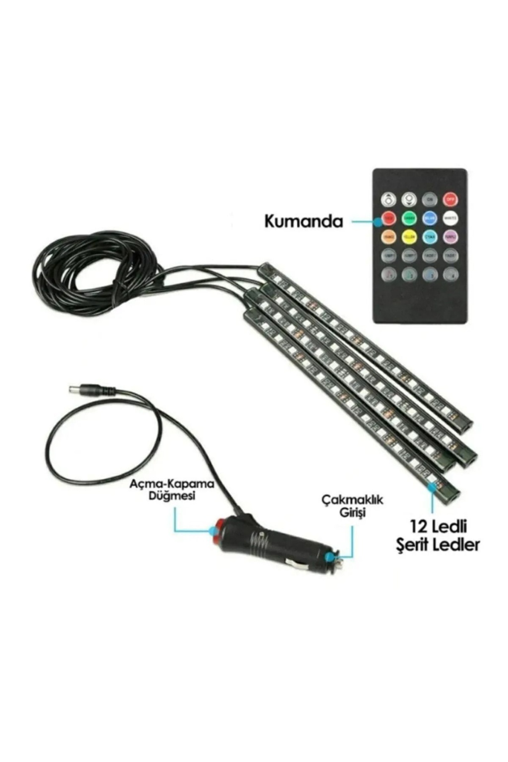 » 12 volt tüm araçlarda kullanılır.Renk kontrollerini, açma-kapama işlemlerini müzikğe duyarlı fonksiyonlarını vb.