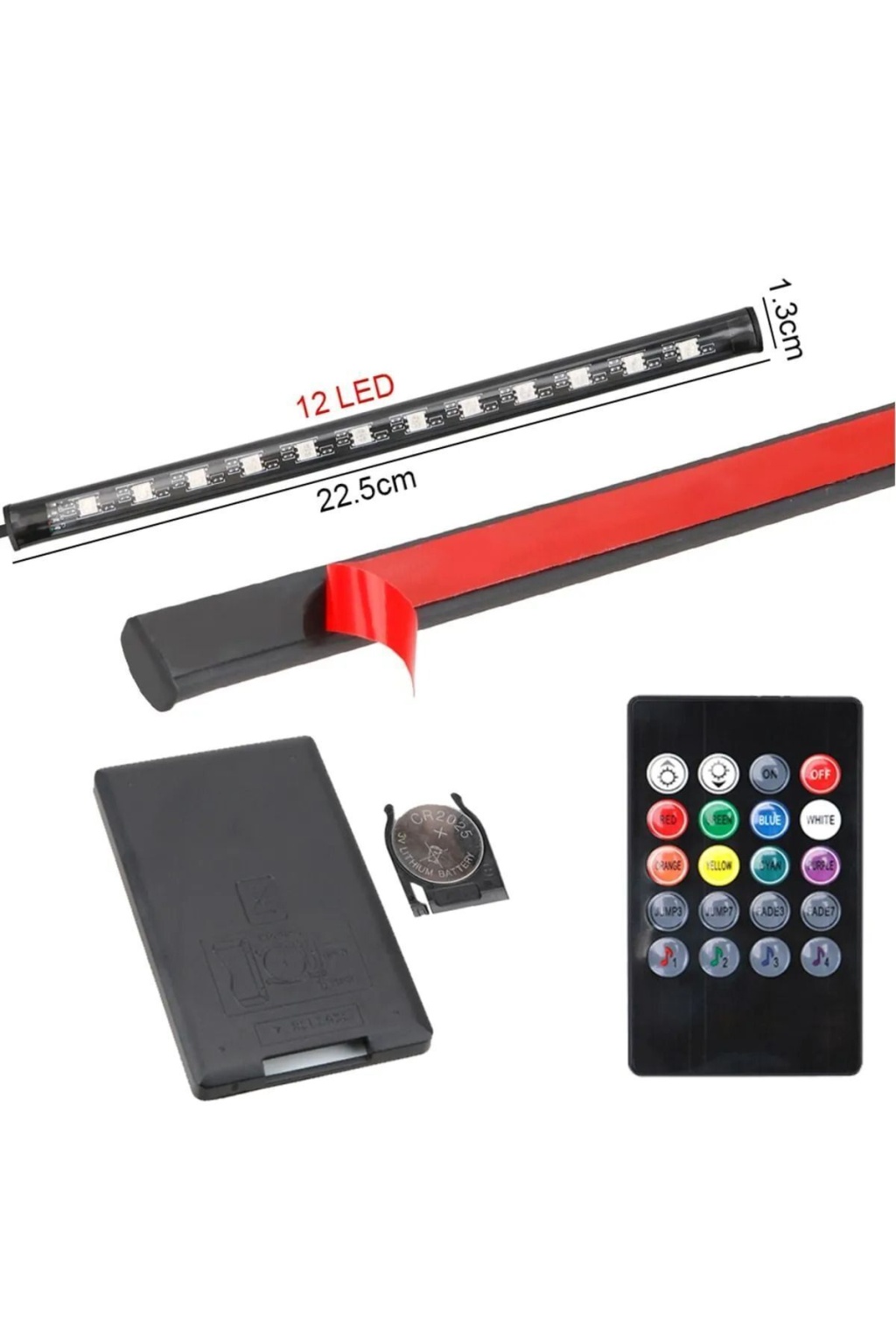 12 Ledli Ayak Altı Led Lamba Sese Duyarlı Led Müziğe Duyarlı Led Led EbatlarıEn : 1.2 cmBoy : 21 cm Müziğin ritmine göre ışıklar renk değiştirmektedir.; ; Dilerseniz kumandası ile istenilen renkte istenilen tonda ve modda ışıkları yakabilirsiniz.; ; Yapmanız gereken aracınızın içerisinde uygun alanlara 3M bant ile monte etmek ve çakmaklığa takmak.; ; Bundan sonra aydınlatmalarınız aracınızın içerisinde bambaşka bir hava verecektir.; ; 1 günde teslimat;
