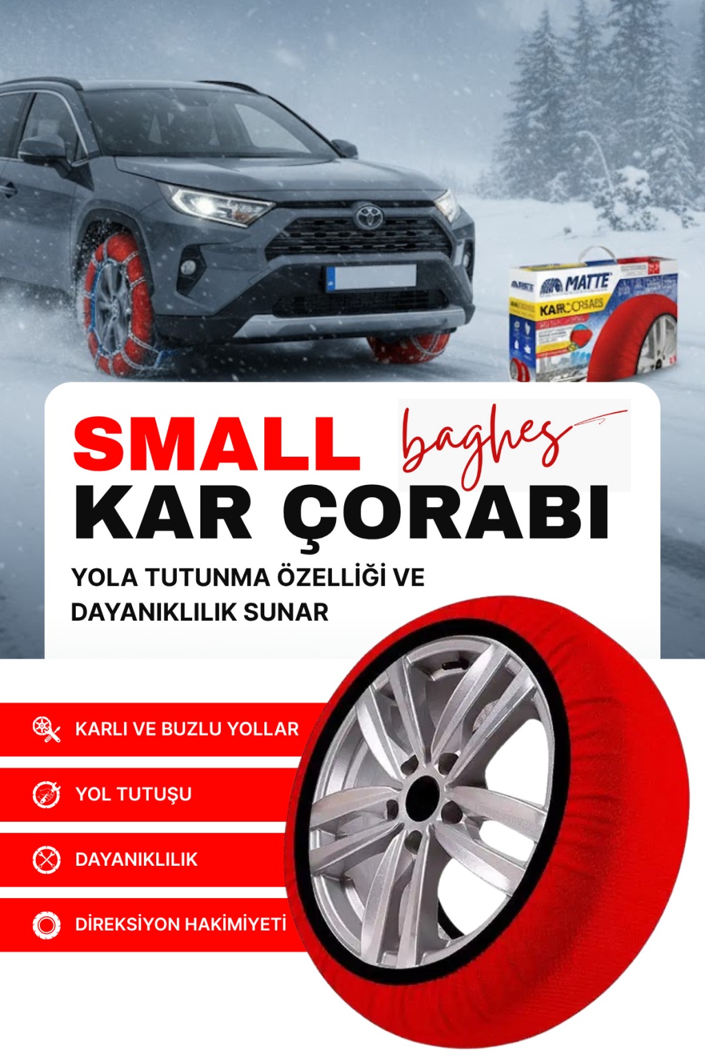 Matte Active Serisi Kar Çorabı, karlı ve buzlu zeminlerde yüksek çekiş sağlayan özel dokusu ile güvenli sürüş sunar. Esnek, dayanıklı yapısı sayesinde lastiğe tam uyum sağlar ve hızlıca takılıp çıkarılabilir. Hafif, katlanabilir tasarımı ile bagajda az yer kaplar.