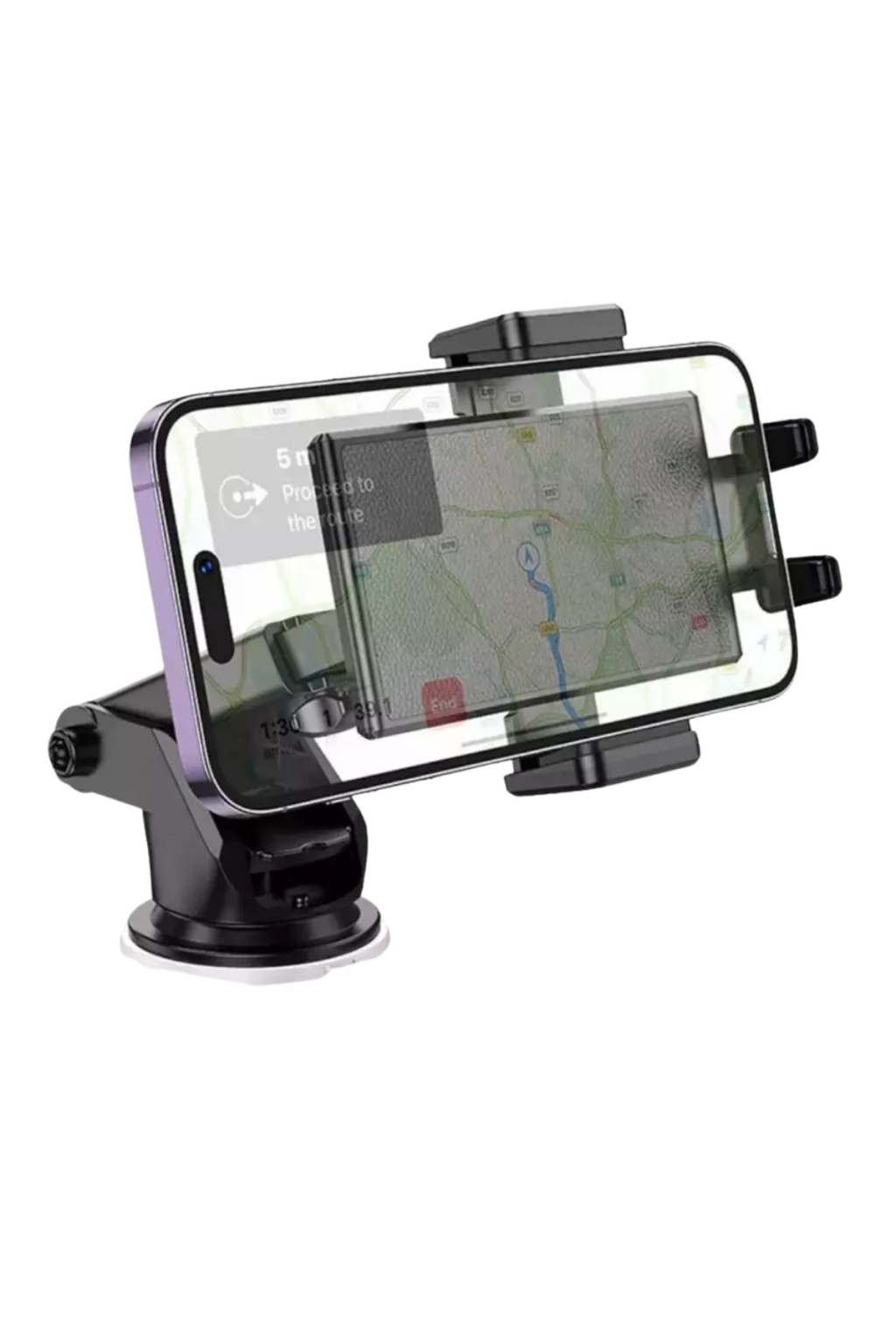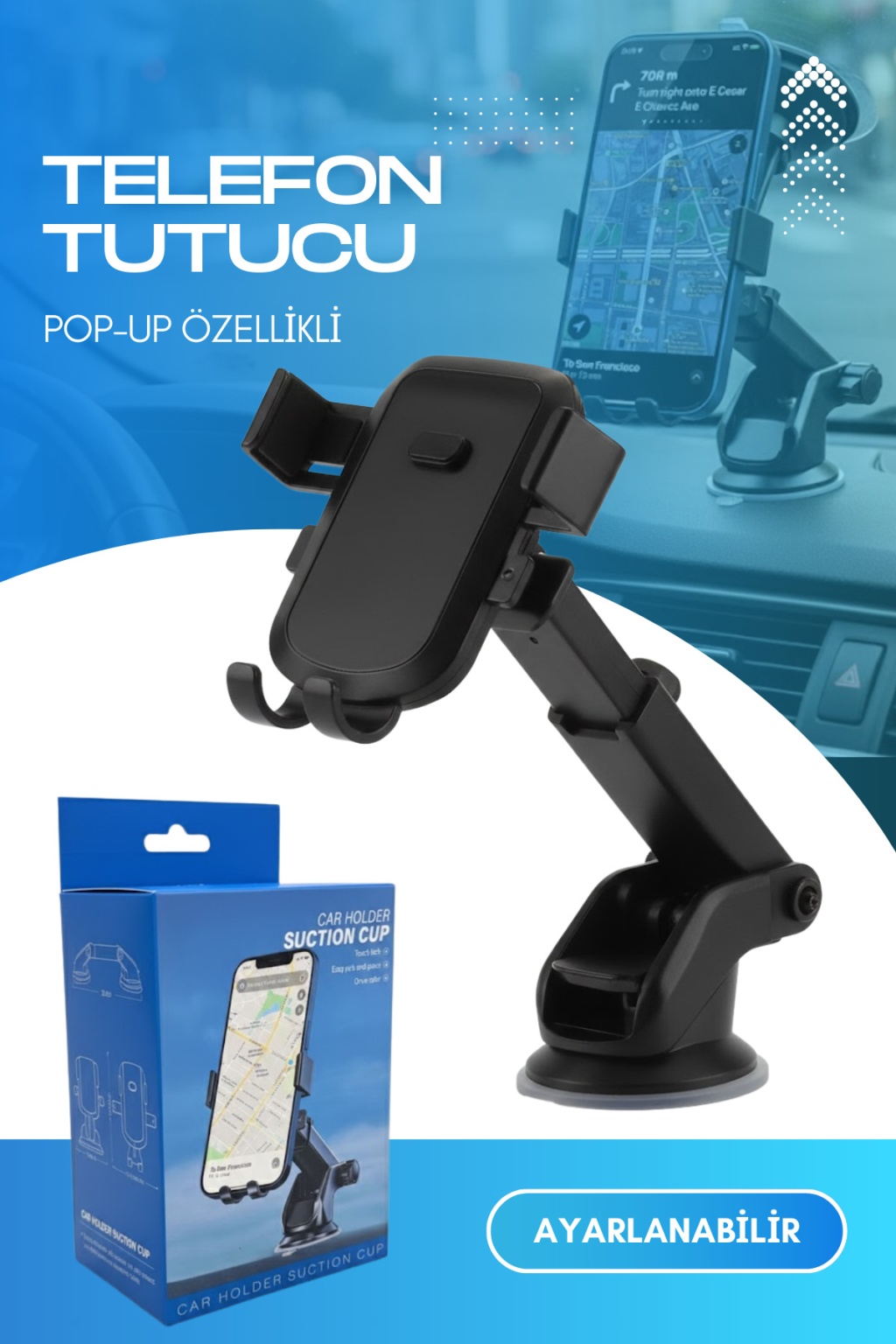 Bu otomobil telefon tutucusu, plastik vakum pedi ile torpido ve konsol üzeri için uygundur.; ; Şasi 360 derece dönüş ve 360 derece dönen top bağlantısı sayesinde istenilen açıya ayarlanabilir.; ; Pop-up düğmesi ve otomatik kilit özelliği ile telefonu güvenle sabitler.; ; 60 mm ile 105 mm arasındaki telefonlar ile uyumludur.; ; Silikon tutuş mekanizması telefonun kaymasını engeller.; ;