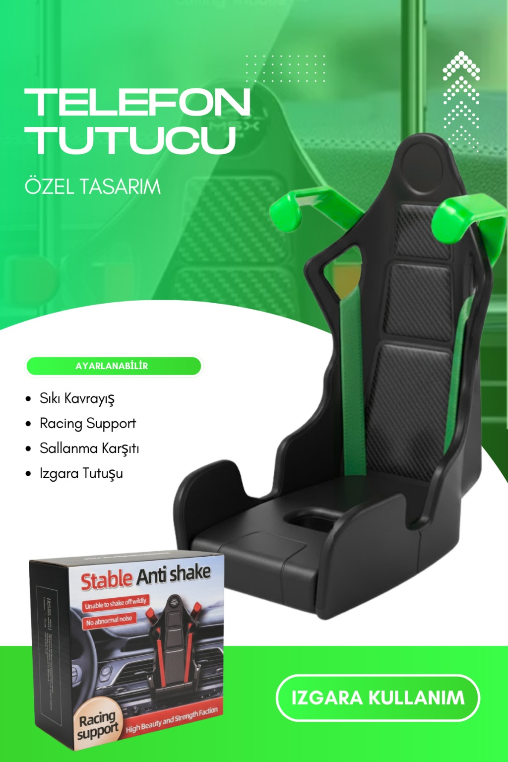 • Bu araç içi telefon tutucu, ergonomik ve şık yarış koltuğu tasarımına sahip benzersiz bir üründür.