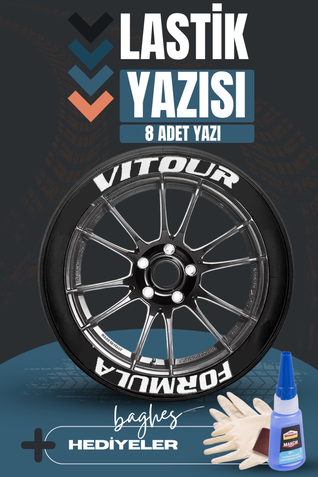 Set İçeriği: 8 adet lastik yazısı, 1 adet ultra premium yapıştırıcı, 1 çift eldiven ve 1 adet zımpara içerir.
